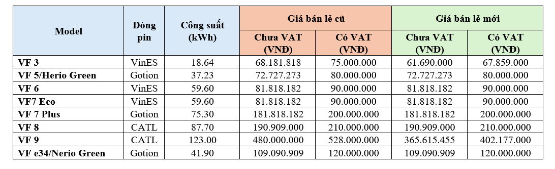 • Phần lớn các dòng xe phổ thông như VF 5, VF 6, VF 7, VF 8 vẫn giữ nguyên giá pin so với trước, cả ở mức chưa VAT và đã VAT.