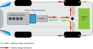 Theo sơ đồ trên, khi lái xe bình thường, động cơ điện (Electric motor/Generator) lấy năng lượng từ khối pin giúp bánh xe chuyển động (đường màu đỏ). Khi nhấn chân phanh, động cơ điện sử dụng bộ chuyển đổi điện để đảo chiều từ trường, động cơ lúc này trở thành máy phát điện. và có nhiệm vụ ngược lại với động cơ. Máy phát điện biến đổi động năng, nhiệt năng, sinh ra khi phanh thành năng lượng điện, thu hồi và lưu trữ năng lượng điện sinh ra trong khối pin (đường màu xanh lá cây). Khi đảo chiều từ trường, động cơ điện cũng sẽ sinh ra mô-men hãm (có chiều ngược lại với mô-men xoắn) và điện trở, giúp giảm tốc độ của xe.