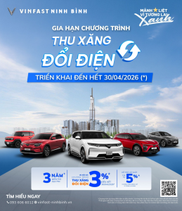 VinFast Ninh Bình trân trọng thông báo tới Quý khách hàng: quyết định gia hạn chương trình hỗ trợ khách hàng chuyển đổi sang xe điện gia hạn thêm đến hết ngày 30/04/2026, nhằm tiếp tục chia sẻ áp lực chi phí nhiên liệu và đồng hành cùng cộng đồng trong bối cảnh giá xăng dầu biến động.